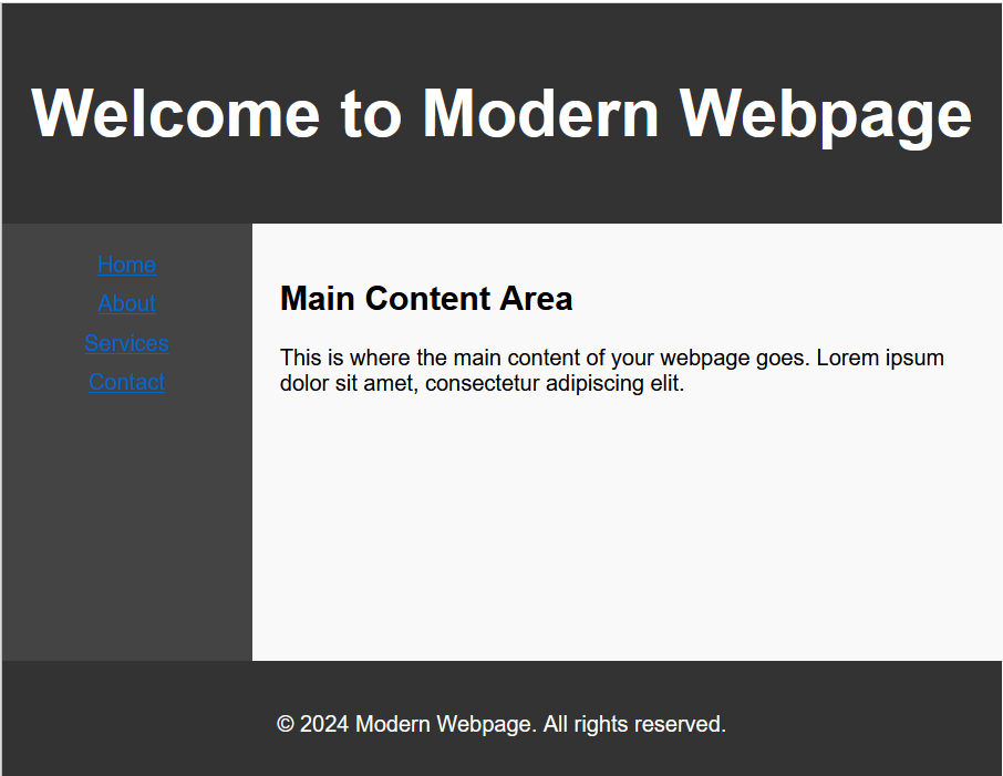 Objective: The objective of this exercise is to replicate the layout of a modern webpage using HTML and CSS. By completing this exercise, you will practice your skills in structuring webpages and using CSS for layout design.